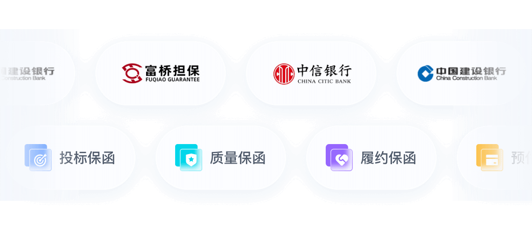 各个银行、保险、担保机构入驻,为客户提供全供应链场景全品类的保函服务,小额快速、大额授信、疑难杂症、同时质优价廉,满足客户各种需求,综合适配